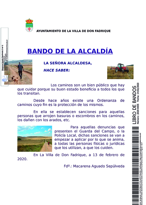 La alcaldesa socialista de La Villa de don Fadrique, Macarena Aguado Sepúlveda, ha informado a través de un bando de la importancia de mantener en buen estado los caminos "siendo como son las arterias de una actividad económica, la de la Agricultura, cuyo pilar es básico para el sustento de nuestro municipio y de nuestros vecinos."