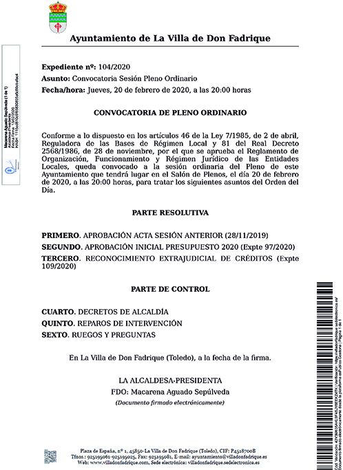 La alcaldesa de La Villa de Don Fadrique, Macarena Aguado, convoca el pleno ordinario de este mes de febrero, para el próximo jueves 20 de febrero a las 20.00h en el Salón de Plenos del Ayuntamiento de la localidad fadriqueña. En él se tratarán los siguientes puntos: